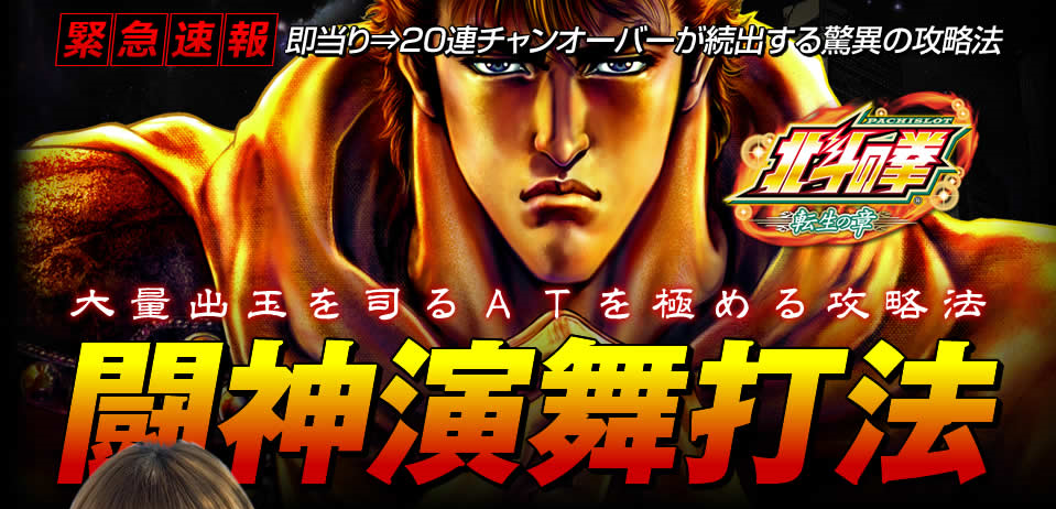 北斗の拳 転生の章『闘神演舞打法』は、まず数回転で現在の台の状態を「好調」「通常」「不調」と判別し、その状態に応じてある動作をすることによって、ハズレ乱数を大当たり乱数に移行させ大当りに導くパチスロ「北斗の拳-転生の章-」攻略法です。