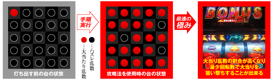 この理論に沿って実践すれば、その機種が本来持っている大当り確率より数倍も高い確率となって、大当りを呼び寄せる事が可能となります。