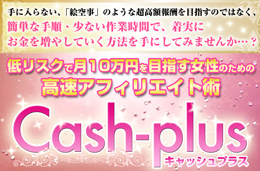【キャッシュプラス】は、アフィリエイトの知識など全くない”素人のごく一般的な主婦”が、メールで受け取った情報だけをもとに、1日20分程度の作業を行っただけで、最初の3ヶ月で、最低でも毎月10万円の報酬を達成し、その1年後には、そのうち約半数以上の方が毎月100万円を稼ぐにまで至っている、自宅で簡単にできる着実なアフィリエイトプログラムです。