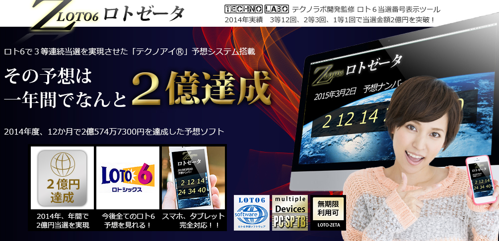 「LOTO-ZETA」は、2億円当選を実現させたロジック「テクノアイ」を搭載したロト6予想システムです。