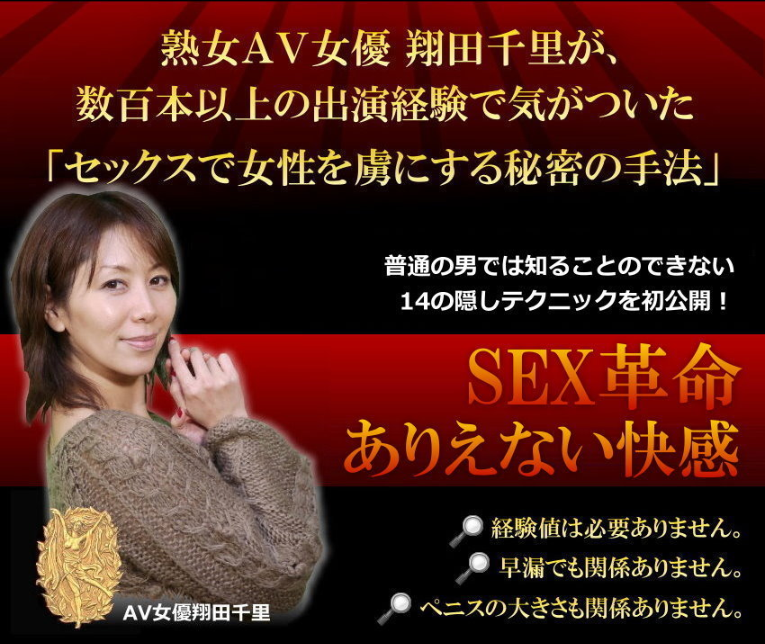 「翔田千里パーフェクト教材」は、熟女AV女優として有名なあの翔田千里が「どんなセックスマスターでも男である限り思いつきません!」と断言する、1回のセックスで女を芯からしびれさせる実践ノウハウです。