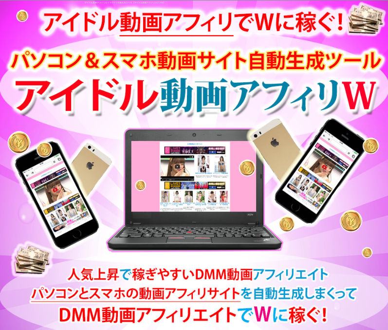 「アイドル動画アフィリエイトW」は、スマホ向けとパソコン向けのアイドル動画アフィリエイトサイトを簡単に作成できるツールです。