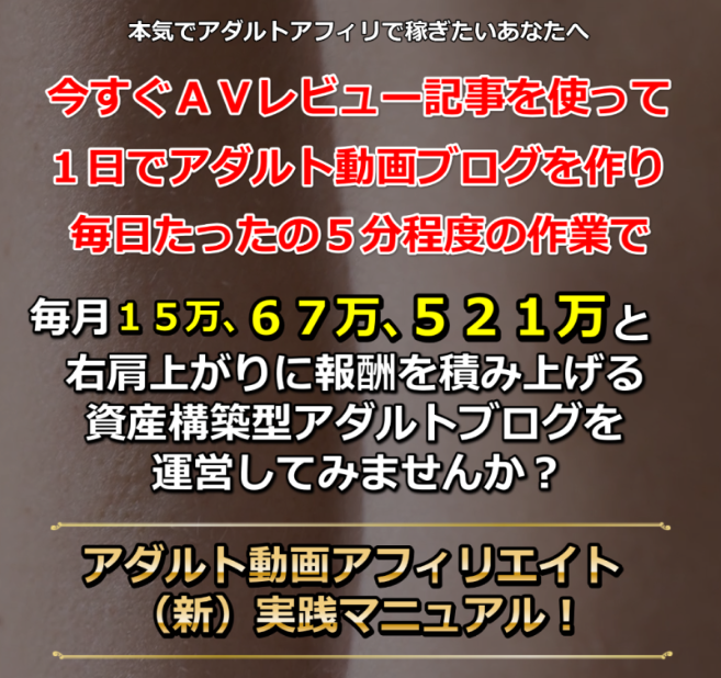 「(新)アダルト動画アフィリエイト実践マニュアル!」は、アダルト動画のレビュー記事とアダルトSEOブログの作り方マニュアルです。