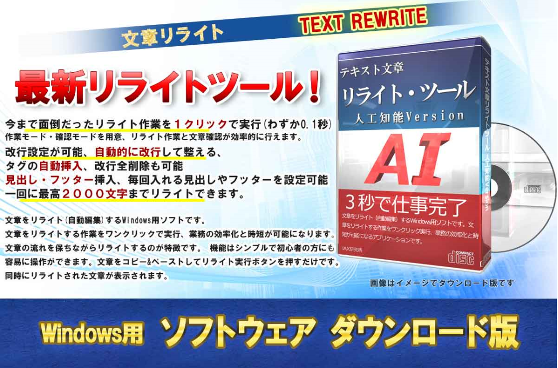 当サイト経由で「テキスト文章リライト・ツール 人工知能」をご購入頂くと、