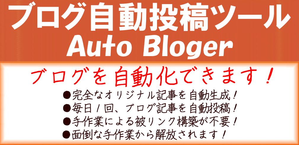 ブログ自動投稿ツール「AutoBloger」は、月額わずか980円で50個の無料ブログに完全オリジナル記事を自動投稿し、ターゲットサイトに被リンクを飛ばすことが出来るサービスです。