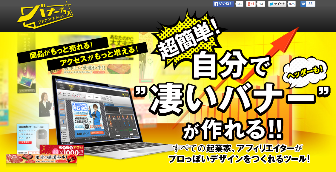 「バナープラス」は、初心者の方でも、「売り上げアップにつながるバナー」や「ヘッダー」が、簡単な操作だけで作れてしまう革新的な画像作成ソフトです。