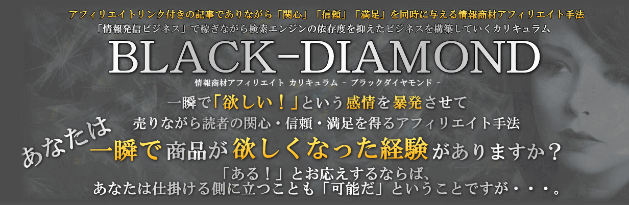 「Black Diamond-ブラックダイヤモンド-」は、読者の「関心・信頼・満足」を得る情報商材アフィリエイト手法です。