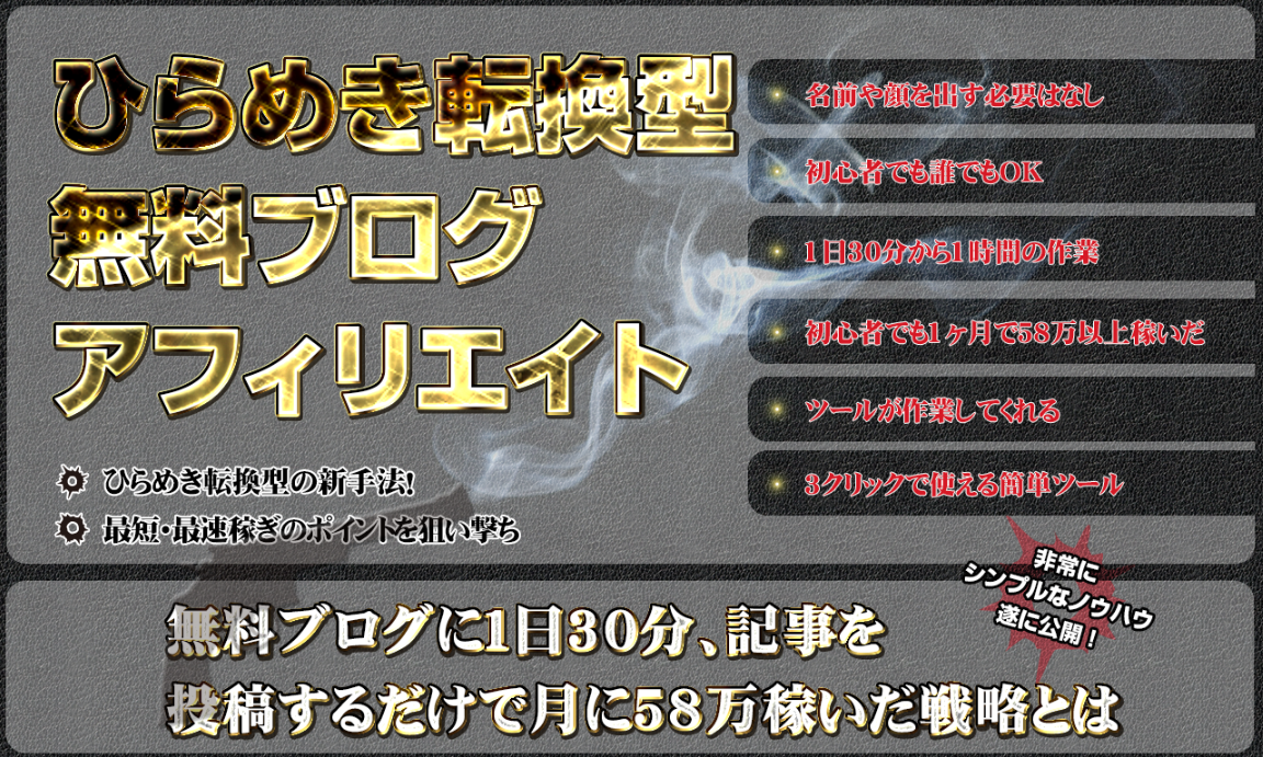 「ひらめき転換型無料ブログアフィリエイトノウハウ+ブログトリガー」は、簡単な記事を無料ブログに投稿するだけで月に58万円稼いだ実績を持つアフィリエイト戦略です。