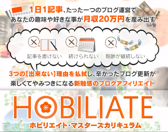「ホビリエイト・マスターズカリキュラム」は、趣味や自分の好きなことに特化したブログを運営してアフィリエイトを展開する、新感覚のトレンドアフィリ手法です。