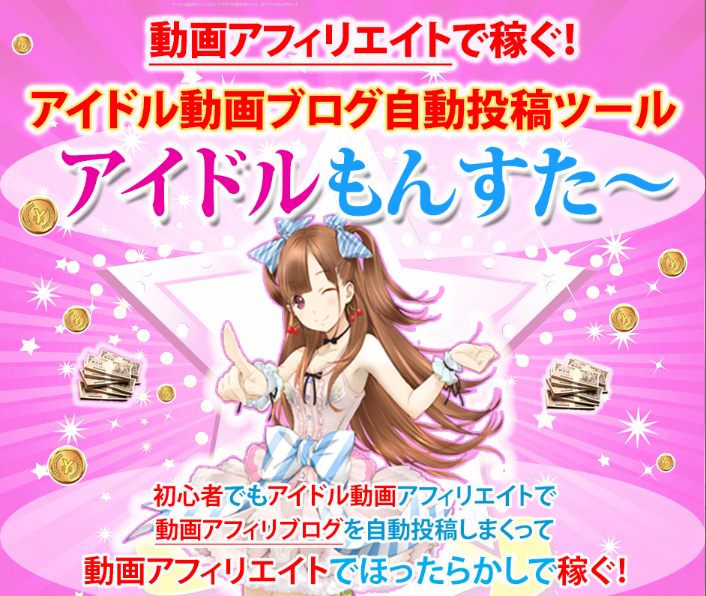 このツールを使うことによって、アイドルの動画アフィリエイト記事を無料ブログやワードプレスに自動で投稿して、アイドル動画アフィリエイトを行うことができます。