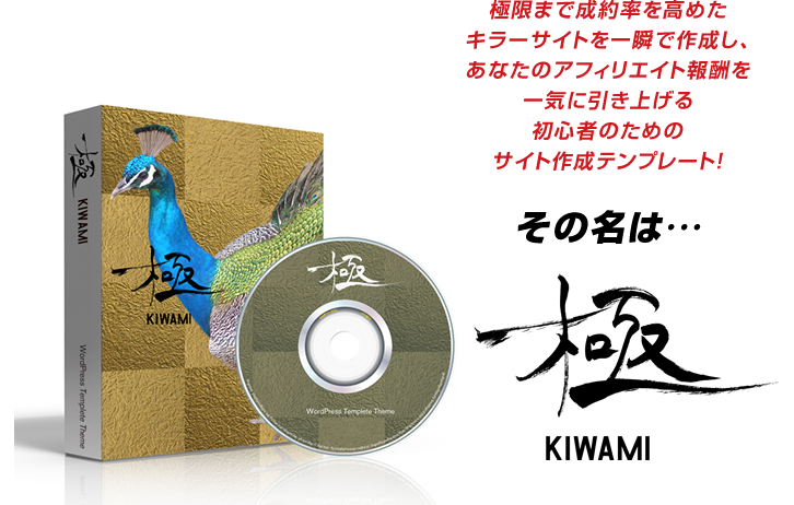 「極:KIWAMI」は、今日アフィリエイトを始めたばかりの初心者さんだとしても、「売れるサイト」、「結果の出るサイト」を超簡単に、たった7分で作り上げることができるという、画期的な仕組みを仕込んだワードプレステンプレートです。