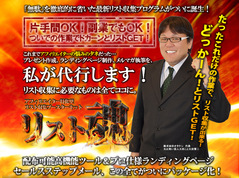 アフィリエイター特化型リスト収集ブースターキット「リスト魂」は、「配布するだけで見込み客リストと報酬を同時に得れる」という非常に強力な配布型アフィリエイトツールとして大ヒットした「D-TOOL」を、アフィリエイター市場向けに特化させたツールです。