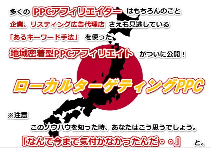 「ローカルターゲティングPPC」は、 「地域名」+○○というPPCキーワード設定手法を応用したPPCアフィリエイト教材です。