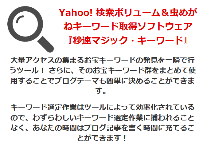 『秒速マジック・キーワード』は、大量にアクセスが集まるお宝キーワードの発見を一瞬で行うツールです。