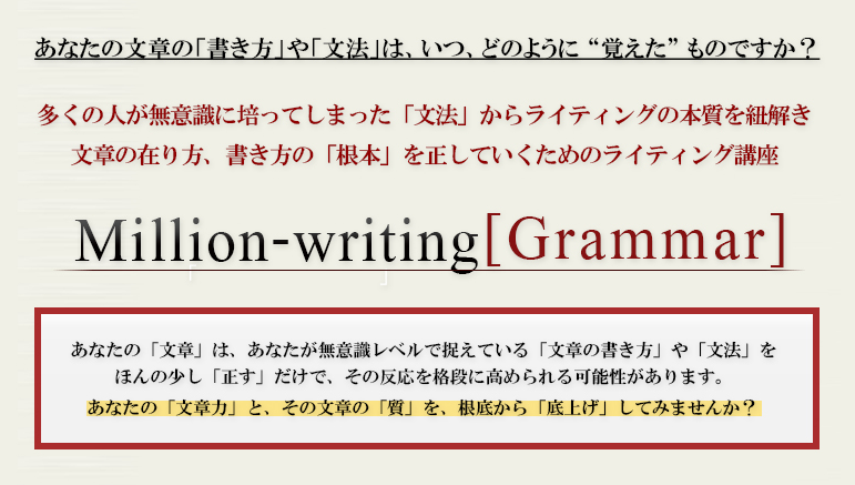 「Million-writing Grammar」は、文章の在り方、書き方の根本を「文法」から紐解くライティング講座です。