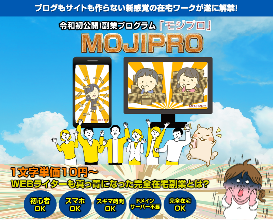 「MOJIPRO」は、ブログもサイトも作らない新感覚の副業プログラムです。