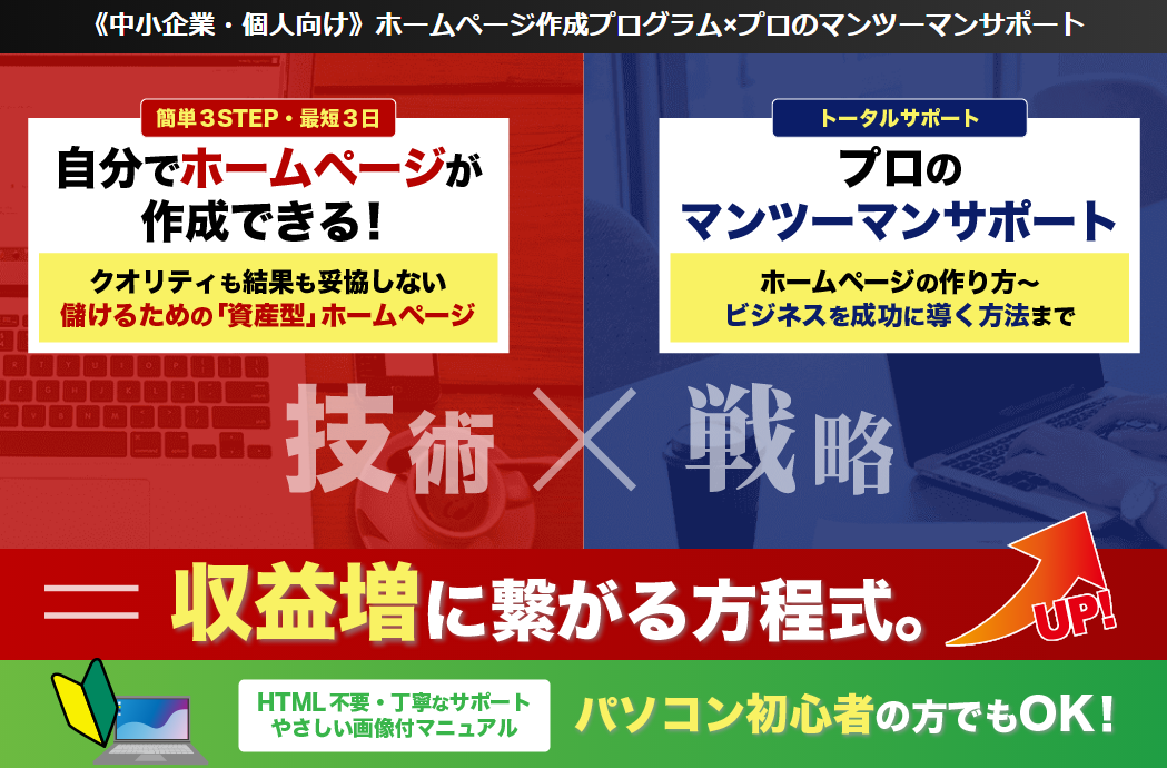 プロがマンツーマンサポートするので、結果(収益)に繋がるホームページを作成することができます。