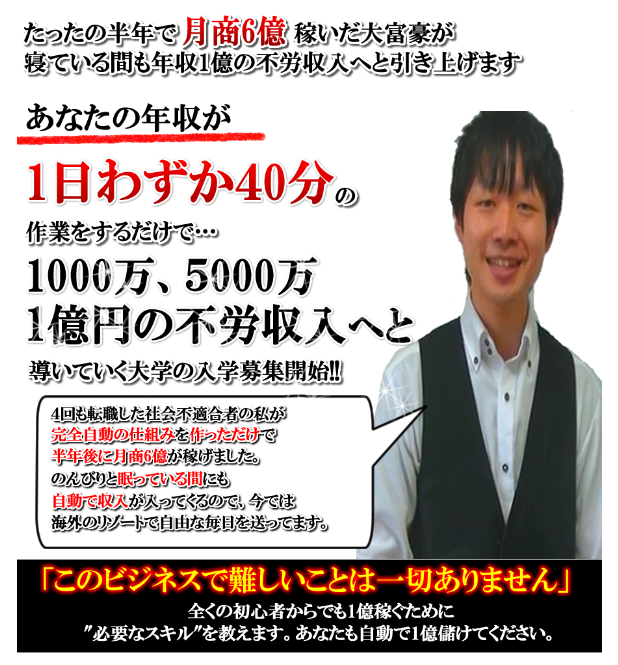 全自動で6億稼ぐ『重政ネット起業大学』では、1日40分で不労収入システムが簡単に作れるでしょう。