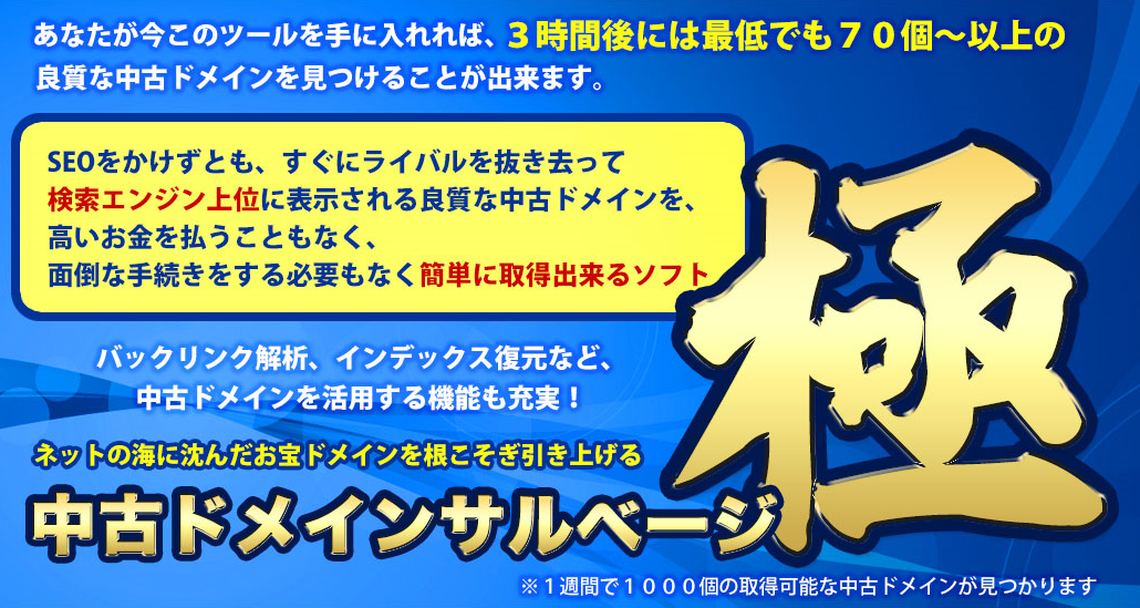 「中古ドメインサルベージ極」は、今までの中古ドメイン発掘ツールには無かった機能が満載の、最新型ドメイン発掘ソフトです。