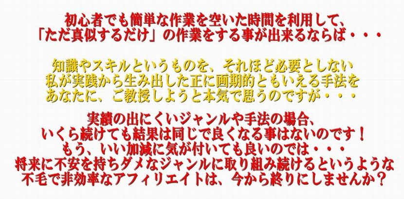 このマニュアルにそって作業をある程度すすめていく段階で、あなたが作成したブログやサイトへ属性の合った見込み客が、なだれ込む事を実感し続々と申し込みをする手ごたえを感じていくハズです。