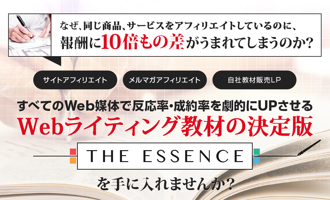 当サイト経由で「「THE ESSENCE」反応率・成約率が劇的にUPした本質のWEBライティング」をご購入頂くと、