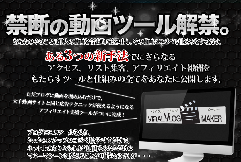 「バイラルビログメーカー」は、ブログの埋め込み動画に視聴制限をかけ、Twitterで拡散、リストビルディング、ワンクリック機能を駆使することで、あなたに稼ぎをもたらしてくれるツールです。