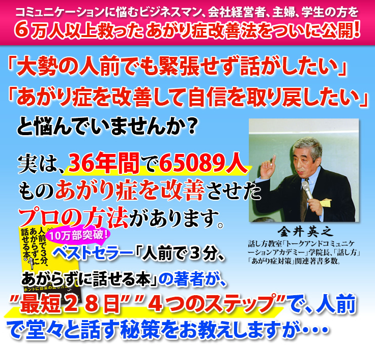 つまり、「あがり症に打ち克つ4つのステップ」を実行すれば、あなたはあがり症の悩みからウソのように解放され、100人、1000人の前でも、自信と威厳をもって力強く話しができるようになるのです。