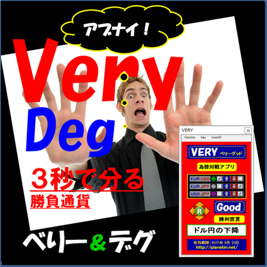 『Deg』チャートの3通貨の値動き(上昇か下降)をそのままアプリの『Very』に入力するだけで、瞬時に通貨の相関の答え(最適通貨)が表示されます。