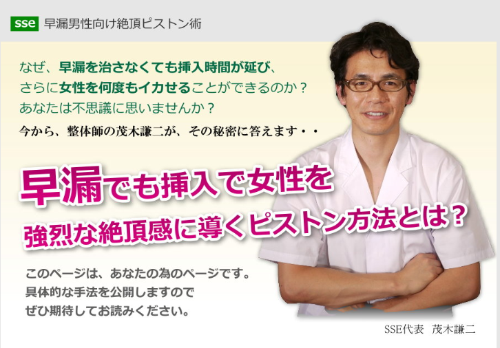 「SSEマスタープログラム (早漏革命)」は、現役整体師が、早漏男性のために開発した『早漏でもピストンで女性を何度もイカせることができる前例のないピストン法』です。