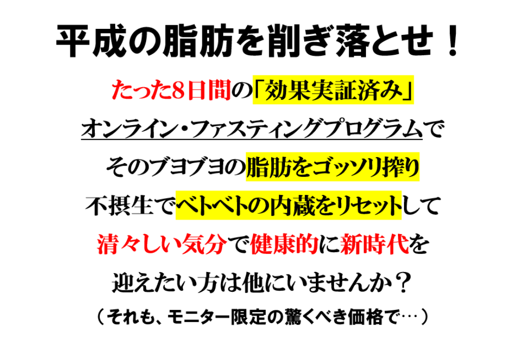 この「オンライン・ファスティングプログラム」は、こんな思いを抱えているアナタにとって、素晴らしい効果をもたらすことでしょう。