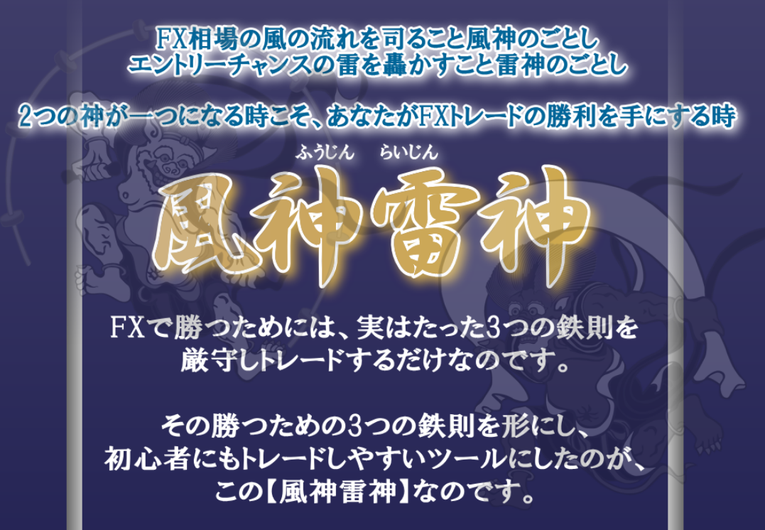 つまりこの【風神雷神】は、FXで勝つための3つの鉄則をロジックに組み込み、初心者でも勝ちトレードを行えるようにしたツールなのです。
