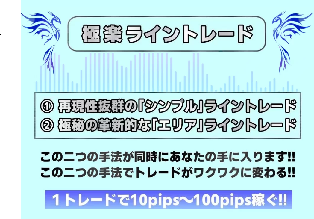 「再現性抜群のシンプルライントレード」と「爆裂利益のエリアライントレード」という2種類のトレード手法が手に入ります。