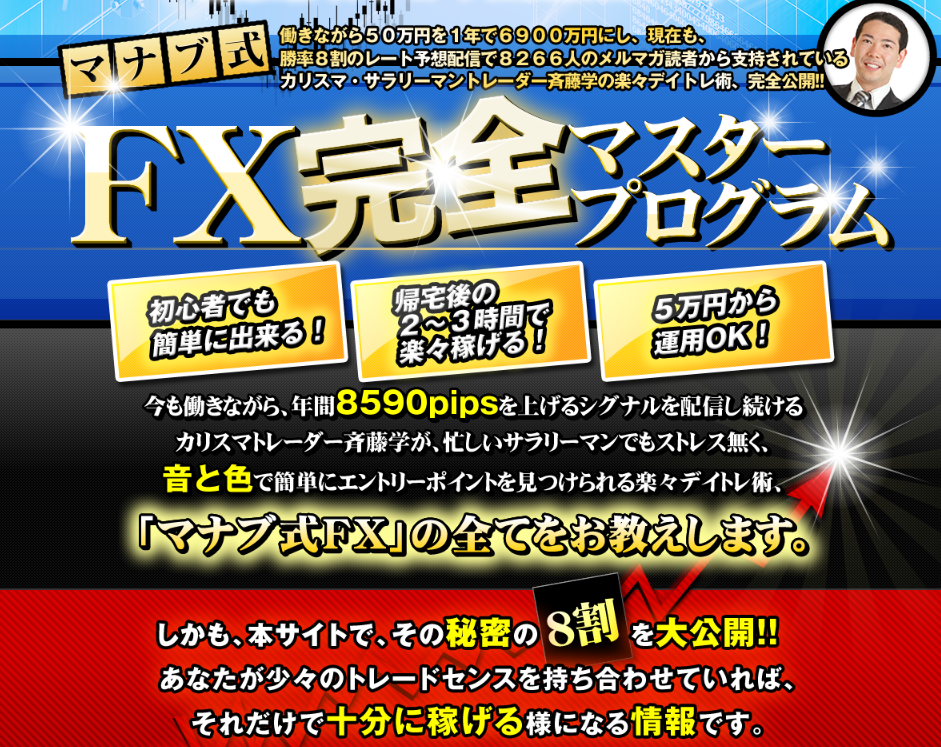 「マナブ式FX完全マスタープログラム」は、働きながらでも帰宅後の2〜3時間で十分実践できる、カリスマ・サラリーマントレーダー斎藤学氏の楽々デイトレ手法です。