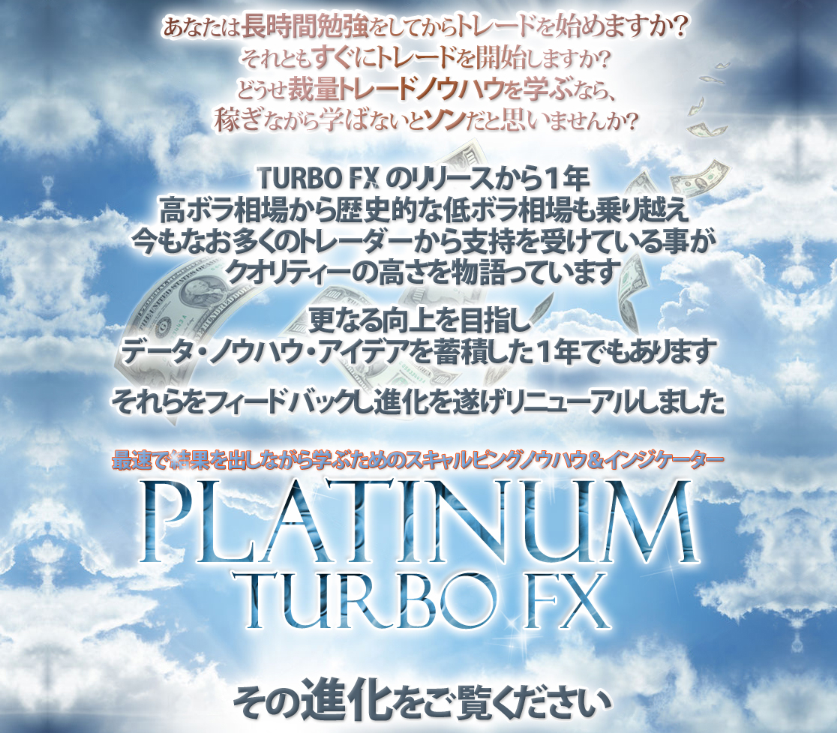 「PLATINUM TURBO FX」は、好評だった前作「TURBO FX」から稼動データ、ノウハウ、アイデアをフィードバックし進化を遂げた、最速で結果を出しながら学ぶためのFXスキャルピングノウハウ&インジケーターです。