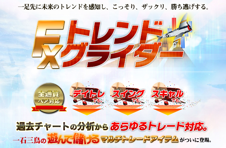「FXトレンドグライダー」は、過去チャートの分析からあらゆるトレードに対応したしたFXマルチトレードアイテムです。