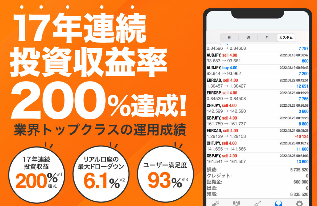 バックテストで17年以上、実運用でも5年以上安定して利益を上げているシステムです。