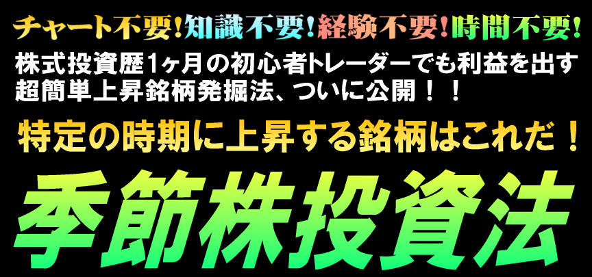 「季節株投資法」は、特定の時期に上昇する銘柄を発掘してトレードを行う超簡単上昇銘柄発掘法です。