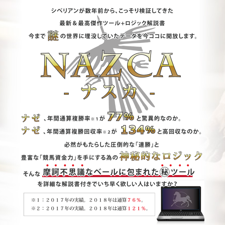 競馬予想の「答え」を一発表示する『NAZCA(ナスカ)』を片手間で活用いただければ、もう「馬券が当たらない」ということはないはずです。