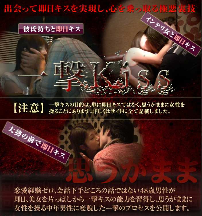 出水聡の女性を思うがままにする『一撃Kiss』は、恋愛経験ゼロ、会話下手どころの話ではない48歳男性が、即日美女を片っ端から一撃キスの能力を習得し、思うがままに女性を操る中年男性に変貌した一撃のプロセスです。