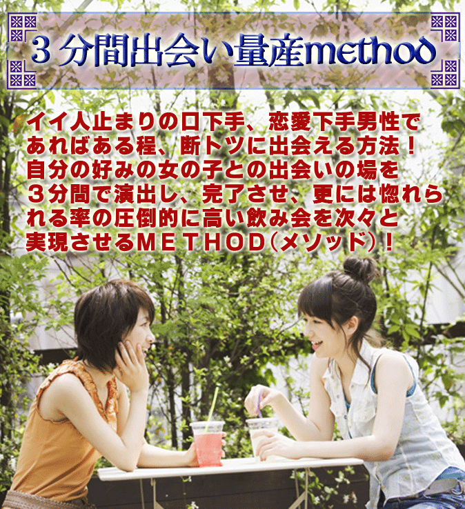 「3分間出会い量産METHOD」は、自分好みの女の子との出会いの場を3分間で演出し、さらには惚れられる率の圧倒的に高い飲み会を次々と実現させるメソッドです。