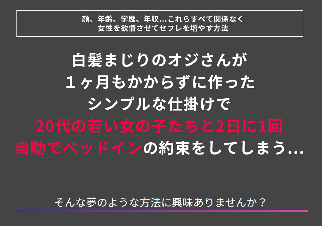 交際費を1円も使わずホテル代だけで即ヤリ「出会い自動量産システム」は、出会い系サイトやマッチングサイトを使わずにセフレを増やす方法です。