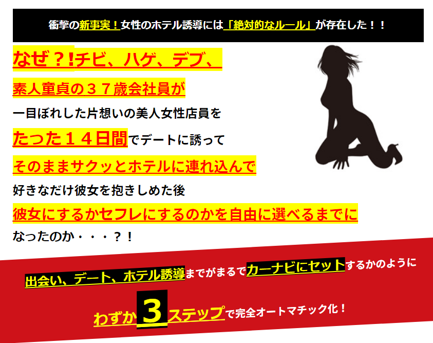 お手軽簡単に女性をホテル誘導できるだけでなく、女性との出会いを量産する方法や狙いの女性を落とす方法、セフレを量産する方法といった恋愛において大変有効なスキルやメソッドを無理なく自然に学ぶことができます。