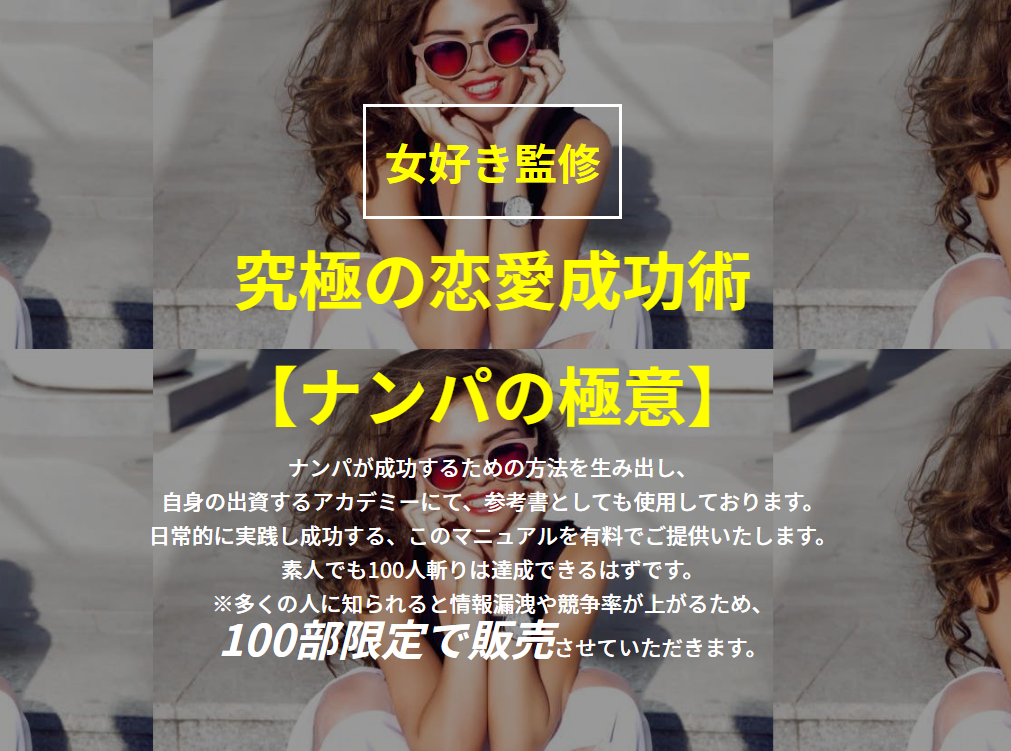 「女好き監修 究極の恋愛成功術【ナンパの極意】」は、伝説のナンパ師女好きが監修し、ナンパアカデミーにて完成したナンパ総集編です。