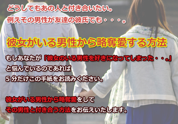 「略奪愛講座。彼女がいる男性から略奪愛する方法。三川恵子が教える略奪愛講座」は、彼女がいる男性からは略奪愛をしてその男性と付き合う方法をまとめたマニュアルです。