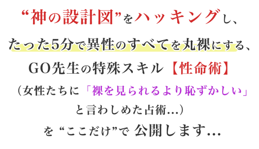 占術家GO先生の「特殊スキル性命術」をマスターして、女性との出会いや恋愛にフル活用していくマニュアルになっています。
