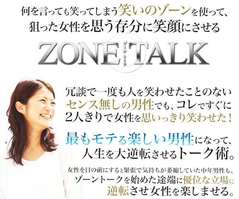 女性を楽しませる技術の集大成【ZONE TALK-ゾーン トーク-】は、女性の前で緊張して 赤面してしまう方や、会話下手で女性との会話が続かない恋愛下手な方がすぐに変わるためのプログラムです。