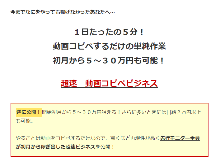「超速 動画コピペビジネス」は、開始初月から5〜30万円狙えるネットビジネスノウハウです。