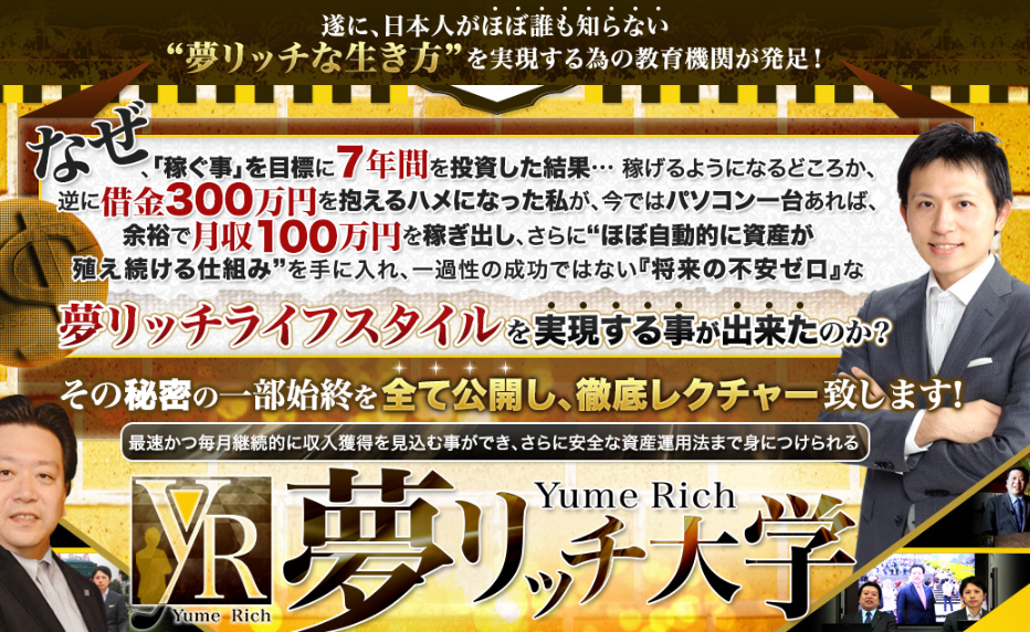 夢リッチ大学は「お金を稼ぐ方法」はもちろん、「稼いだお金を殖やす方法」までをお伝えする為に立ち上がったプロジェクトです。