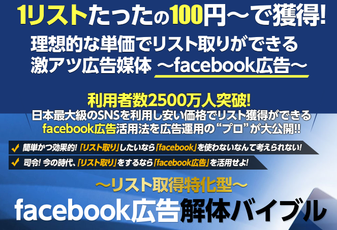 「Facebook広告解体バイブル」は、Facebook広告の「ある機能」を利用したリスト取りマニュアルです。
