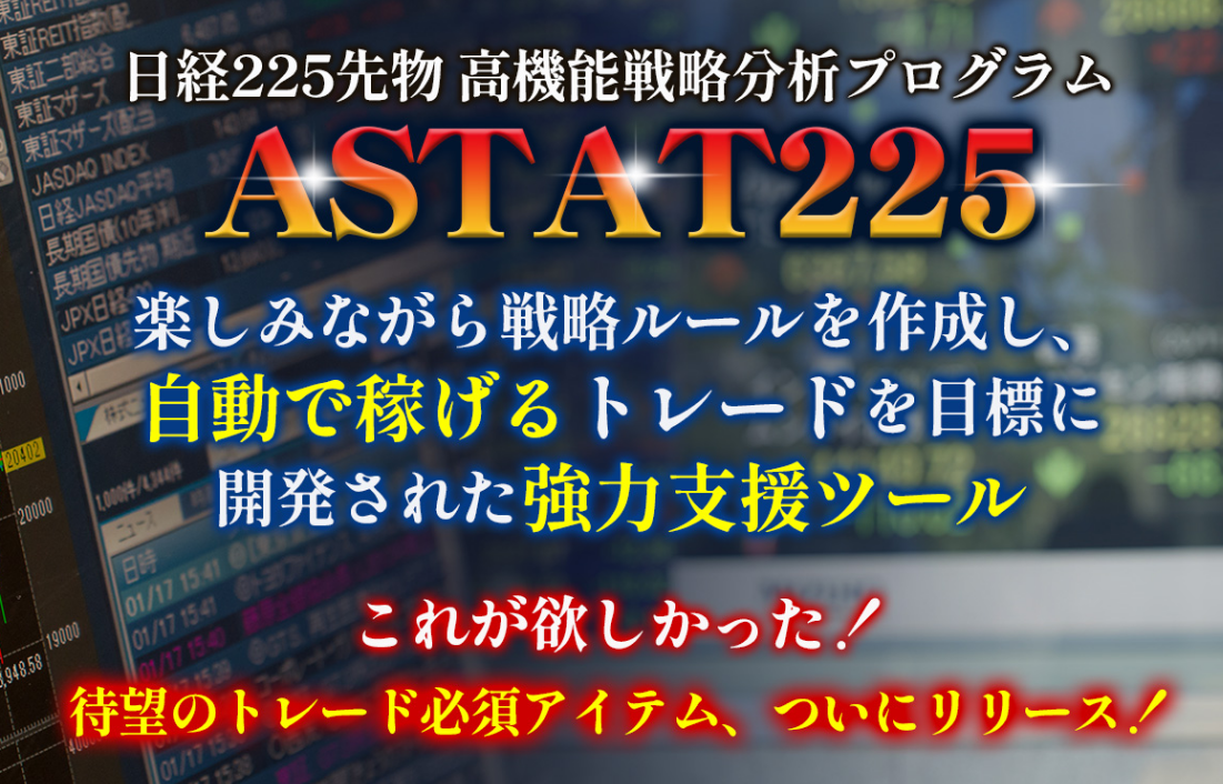 「ASTAT225」は、日経225先物の自動売買ができるサービス「オートレ225」の使用を前提として開発された、システムトレード強力支援ツールです。